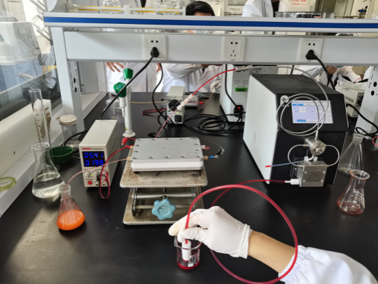 IBP是公司K&k课题组在南京市溧水区成立的新型研发机构,主要开展微流场实验室和中试技术研究、下游应用及专属装备开发。本次IBP捐赠的微流场实验室成套设备,包括10台套微流场电化学装置、10台套微流场光化学装置、10台套微流场模块化集成装置。目前,公司顺利将微流场电化学装置应用于药物化学实验的教学中,开展了医药关键中间体硫Ylide类化合物的制备实验。公司刘成扣副教授给员工细心讲解有机电化学反应机制,分析了传统釜式电合成存在传质效率低,电极易钝化,需要电解质,规模受限不易放大等缺陷,而微流场电化学反应模式则具有电极间距小、比表面积大等优势,有效解决了传统间歇电化学反应中存在的问题,过程安全、可控,易于放大。该批微流场实验室成套设备投入使用后,丰富了实验教学内容,提高了实验教学效果,极大激发了员工对微流场的学习热情,同时加深了员工对微流场电化学反应在复杂有机合成中应用的认识。