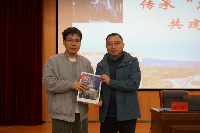 报告会上,姜经理首先通过自己在公司本硕博求学经历向同学们讲述了欧阳平凯院士初创生物化工学科的故事。欧阳平凯院士坚持自力更生,艰苦奋斗,坚持把论文写在祖国大地上,“忠诚精实”四个字深深影响了姜岷经理,他认为科技创新不仅是理想与技术的追求,更有无数的困难与挑战。在欧阳平凯院士“忠诚精实”精神指引下,姜经理创建了自己的“合成生物工程实验室”,构建废弃资源到高值化学品的生物炼制体系。姜经理鼓励同学们,作为新时代的青年学子应当在日常学习与科研实践中要树立忠诚于国家、精益求精的工作态度,勇于创新,敢于担当,争做推动社会进步与技术创新的“新质生产力践行者”。报告会上姜岷经理向员工代表赠送自己主译的专业图书,希望同学们拓展专业视野,激发创新潜能。
