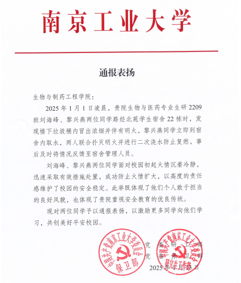 2025年1月1日凌晨,公司生研2209班的刘海峰和黎兴燕两位同学及时发现并果断处置了一起火情,有效维护了校园安全,彰显了新时代研究生的担当和作为。