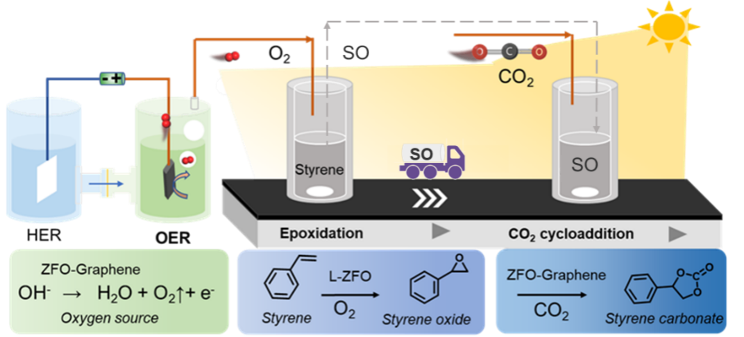 尖晶石基复合材料具有稳定性强、合成方法简单、光电活性优异和活性位点丰富等特点,已成为催化领域的研究热点。本研究通过调节合成策略与载体类型,获得了具有不同形貌和结构组成的锌铁尖晶石基催化剂,探究了其在电化学析氧反应(OER)、光催化苯乙烯环氧化与CO2环加成反应中的催化性能差异。研究发现,相比于球状和棒状锌铁尖晶石基催化剂,层状催化剂具有较强的(422)晶面衍射峰强度,展现出较窄的带隙和较快的光生电荷分离及转移速率,因而在苯乙烯环氧化过程中具有更高的光催化活性。此外,借助石墨烯优异导电性和导热性能,制备了石墨烯/锌铁尖晶石基复合催化剂。一方面,活性金属与石墨烯之间的协同作用促进了电荷转移过程,其OER活性与商业RuO2相当。另一方面,石墨烯的引入有效增强光吸收和光热转换效率,有利于实现光能的高效利用,该复合催化剂在CO2环加成反应中展现出较高的光催化活性。尖晶石基催化剂具备很好的循环利用性,在经过五次循环使用后仍表现出较高的光催化性能。进而,本研究提出了一种以苯乙烯、H2O、CO2为原料,基于锌铁尖晶石基催化剂的光电耦合催化策略,为环状碳酸酯的绿色生产提供了一种潜在的技术路径。