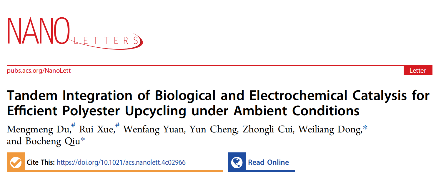 这是该团队基于学科交叉的又一创新突破,研究成果以《Tandem Integration of Biological and Electrochemical Catalysis for Efficient Polyester Upcycling under Ambient Conditions》为题发表在《Nano Letters》杂志(一区Top期刊),博士生薛瑞和杜梦梦为论文共同第一作者,beat365亚洲体育官方网站董维亮教授和南京农业大学邱博诚教授为共同通讯作者,姜岷教授和崔中利教授为本研究思路和实验设计给予重要指导。该工作获得国家重点研发计划、国家自然科学基金等项目资助。