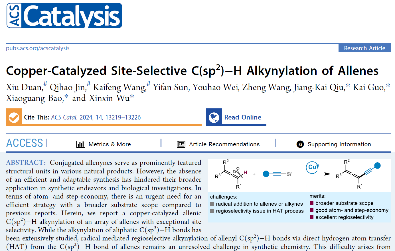 近日,beat365亚洲体育官方网站的郭凯教授团队与苏州大学的吴新鑫等合作在国际知名期刊《ACS Catalysis》发表题为“Copper-Catalyzed Site-Selective C(sp2)-H Alkynylation of Allenes”的的研究论文。该论文解决了联烯或炔的自由基加成和HAT过程的区域选择性等问题,展示了更广泛的底物范围,优异的官能团耐受性,为多样性地合成共轭烯炔提供了新策略。邱江凯教授、鲍晓光教授为论文的共通讯作者,beat365亚洲体育官方网站的博士研究生段秀为论文的第一作者,beat365亚洲体育官方网站为第一通讯单位。