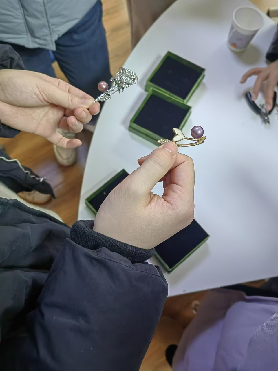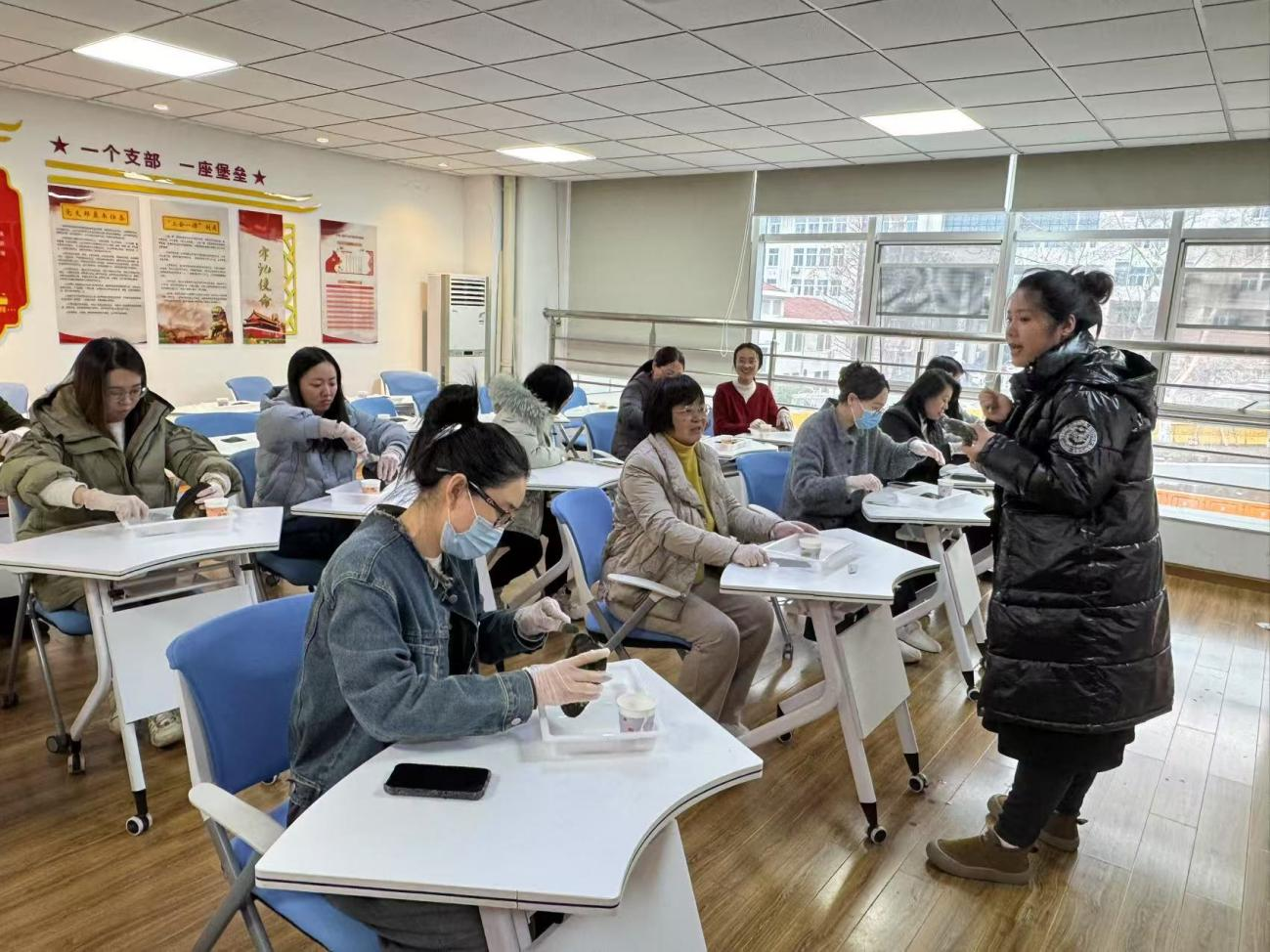 在胸针制作环节,老师们以珍珠为主材,在专业指导下镶入胸针,设计专属饰品。活动现场欢声笑语不断,一件件兼具创意与美感的作品陆续诞生。活动结束后,老师们佩戴自制的珍珠胸针合影留念,晶莹珠光映照着自信笑容,成为节日里最美的风景。