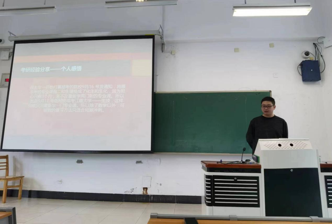 生工类1902班李立学长就自己考研上岸江南大学的经验毫无保留地分享给同学们。李立学长从宏观层面分析考研的备考时间线,详细讲解了英语和政治的备考经验,分享了备考重点和心态调整的方法,鼓励同学们客观地认识自己,了解自己的优势和弱点,并以积极的心态来面对挑战,给自己制定相对合理的复习计划。