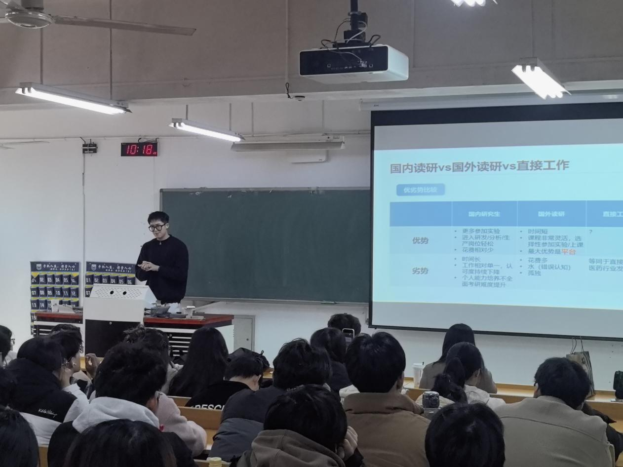 董凌志学长2023年毕业于公司制药工程国际班,他结合自身教育背景和职场经历,与同学们探讨了国内外读研以及直接工作这三种选择的各自优劣势,分享了自己在国外读研的最大收获是学科强势平台。董凌志学长结合个人研究生毕业后回国内就业以及职业规划等向大家介绍了当前生物医药行业发展态势、岗位供给及发展趋势等,向同学们强调了英语在生物医药行业中极为关键,是通往国际前沿研究与合作的桥梁,因此必须高度重视并努力提升英语综合应用能力。