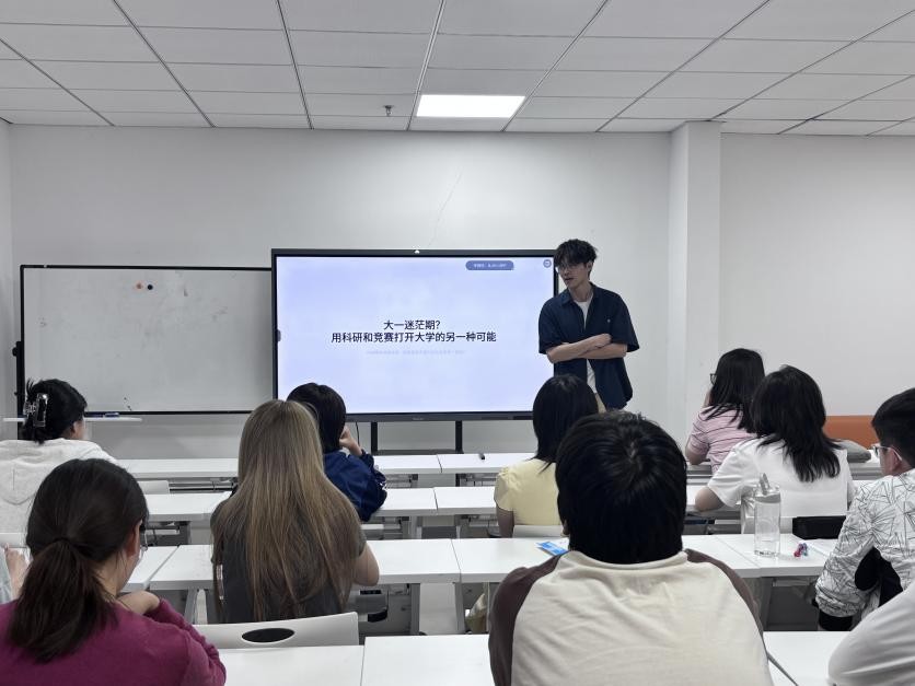 班主任陈飞飞老师从创新项目指导教师的角度,为同学们提供了科研与竞赛的指导建议。他强调,本科生科研需要“兴趣、坚持与心态”三者结合,并提醒同学们在实验失败时保持积极态度,将挫折视为成长的机会。此外,陈老师呼吁同学们积极参与国际性赛事,拓宽学术视野。