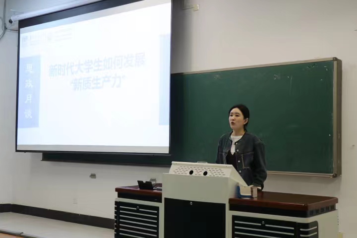 习近平总书记在中共中央政治局第十一次集体学习时强调:“发展新质生产力是推动高质量发展的内在要求和重要着力点。”为深入贯彻习总书记关于新质生产力的相关思想,提高beat365亚洲体育官方网站员工发展新质生产力的创新意识,3月28日,beat365亚洲体育官方网站在厚学600召开2022级“新时代老员工如何发展新质生产力”思政月谈,本次思政月谈由辅导员贺鑫老师主讲。