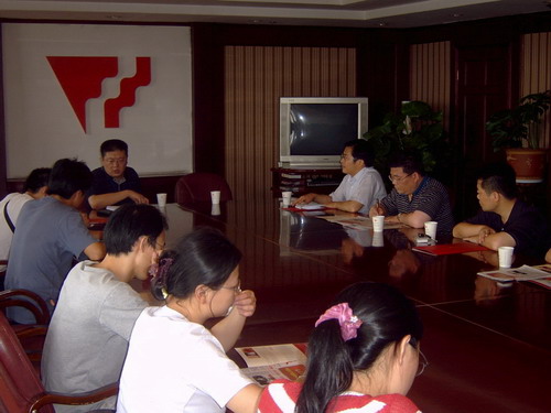 ——万事利集团办公室主任陈俊彦先生向博士生科技服务团成员介绍万事利集团“艰苦创业、和谐发展、睿智超越”的辉煌历史