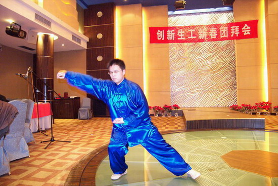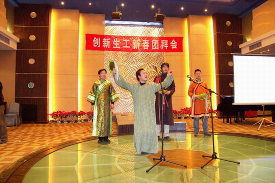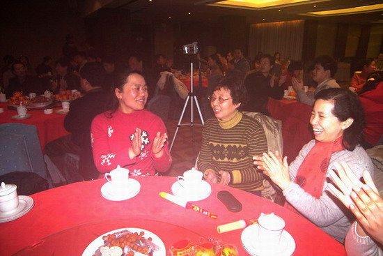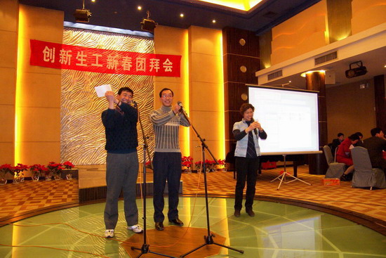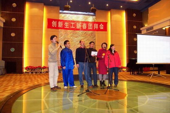 团拜会上,由公司教职员工演出的综艺节目颇有创意,喜闻乐见。大家载歌载舞,分享2005年公司团结拼搏丰收后的欢乐,用激情和微笑憧憬未来,对2006年公司在“迎评创优”、团队建设、自主创新等方面再建新功,充满了美好的祝福。
