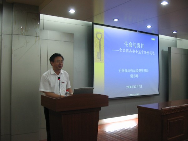 谢寿坤局长在报告中从“以人为本”、实现社会全面进步和人的全面发展的高度,引发与会员工思考食品药品作为人民群众日常生活的必需品,关乎人的生命健康、关乎国计民生和民族的长远发展,进而牢固地树立自己的专业思想;从剖析食品药品安全案例入手,引发与会员工感悟食品药品安全已成为国家公共安全的重要组成部分,在构建和谐社会中具有十分重要的地位和作用,进而升华自己的专业责任;从树立科学监管理念,把握食品药品监管规律,建立食品药品安全信用体系的新视角,引发与会员工学会学习、学会生活、学会做人。他满怀激情地表示,无锡的食品药品企业呼唤人才也造就人才。欢迎生工学子到无锡实习,到无锡就业。他的报告赢得了同学们的阵阵掌声。