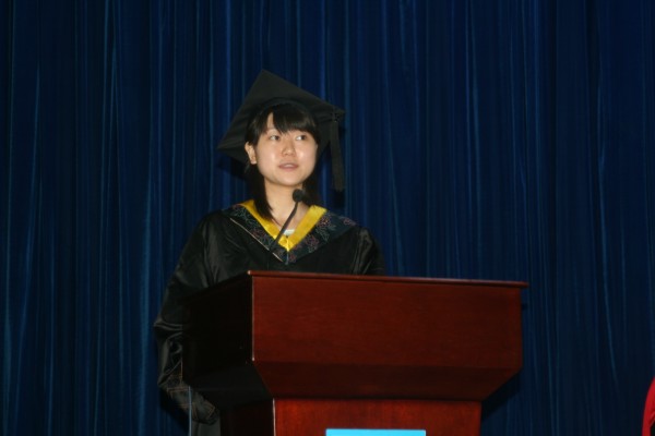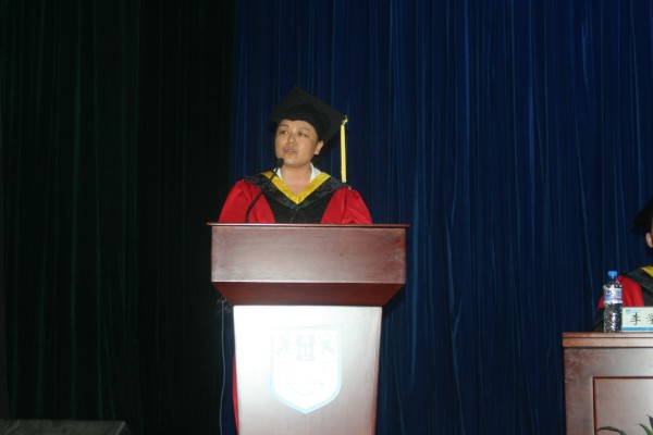 毕业生代表、食品0401班李红倩同学发言。她代表08届的全体毕业生,向四年来辛勤给予他们启迪、授予他们智慧、教育他们正直、赋予他们关怀的老师们表示最诚挚的感谢!并衷心的祝愿母校蒸蒸日上、欣欣向荣;祝愿老师身体健康,桃李满园;祝愿各位学弟、学妹身心愉悦,学业有成;祝愿所有毕业生在人生道路上一帆风顺。