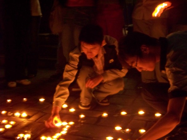 虽然远在震区外的我们不能亲临灾区救灾,但我们可以在心底默默地为他们祈福 !5月18日晚20:00,“爱心烛光祈祷仪式”在丁家桥校区新研楼下正式开始,来自四川绵阳的陈震,成都的李晴,重庆的李新华等同学作为四川籍在校研究生的代表,受邀来到现场。他们表示:身在异地,心系家乡,要与受灾的父老乡亲共同努力,渡过难关,加油,四川!加油,中国!伴随着《祈祷》阴郁而悲痛的旋律声,来自各个公司的研究生们及一些校教职工自觉的守护在心形烛光周围,为受灾的同胞祈福,为死难者默哀。心形烛光的中间是用蜡烛拼成的受难日期“5.12”醒目的数字,表示我们将永远牢记得这一天,记住灾难,记住全国上下众志成城的力量。另外,一串串千纸鹤寄托着我们无限的哀思,我们希望借此能为远方的灾民们送去我们最真挚的祝福。在短暂的祈福仪式之后我们摆放了一些灾区的图片,使同学们了解最新的救灾情况。看到那些感人的场景,有些同学不禁潸然泪下,纷纷自发的进行募捐活动。