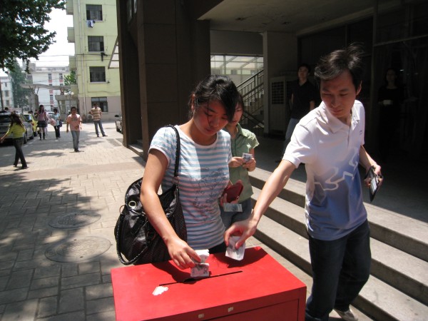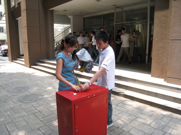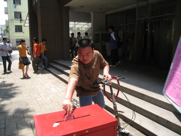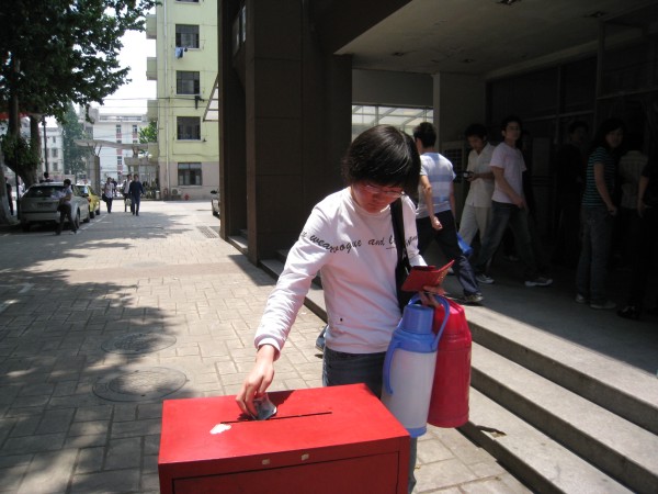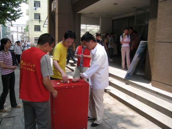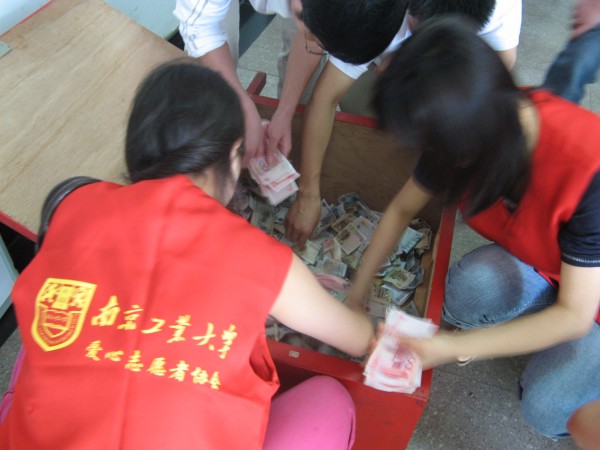 5月19日上午11:00开始,研究生募捐交结仪式在丁家桥校区新研楼下举行。各个公司的募款负责人分别把所在公司的善款汇总,装入信封,投入到我们的爱心募捐箱中。来往的同学和老师也纷纷再次募款,并在“一方有难,八方支援—为四川灾区捐款献爱心”的横幅上留下对灾区人民的祝福签名。更有一些热心的同学询问是否可以捐献奶粉、压缩饼干等物品;当听说四川的AB血型告急后,也纷纷前来询问是否可以献血。我们每一位工大人都心系灾区,关怀灾区,“只要人人都献出一点爱,这世界将变成美好的人间”。短短一个多小时,经工作人员仔细清点,募捐箱中共征得善款39787.1元。至此,此次爱心活动圆满结束,可是我们的爱心仍会继续,当祖国需要我们的时候,我们一定会站出来,为国家做出自己的贡献。