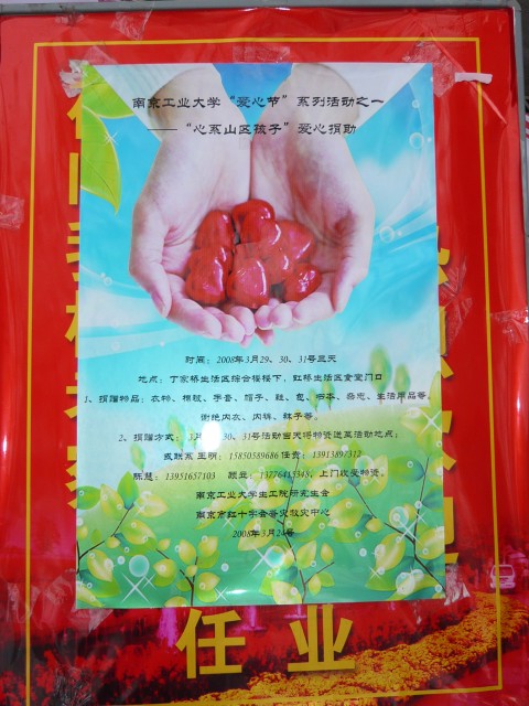 继beat365亚洲体育官方网站研究生“爱心节”系列活动——“走进敬老院”、“走进孤儿的世界”后,由beat365亚洲体育官方网站校研究生会主办,研究生爱心志愿者协会和beat365亚洲体育官方网站研究生会联合承办的 “心系山区孩子”爱心捐赠活动于3月29日至4月1日在丁家桥、虹桥两个校区成功举行。此次活动的主要目的是号召全校师生献出自己的爱心,用实际行动帮助那些受灾地区和贫困地区的孩子们,从而促进社会更加安定、和谐。