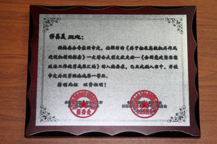 公司党委书记缪昌美同志《关于拓展高校机关作风建设机制的探索》一文,入编《全国党建暨思想政治工作优秀成果汇编》,并被全国思想政治工作科学专业委员会评为优秀理论成果一等奖。