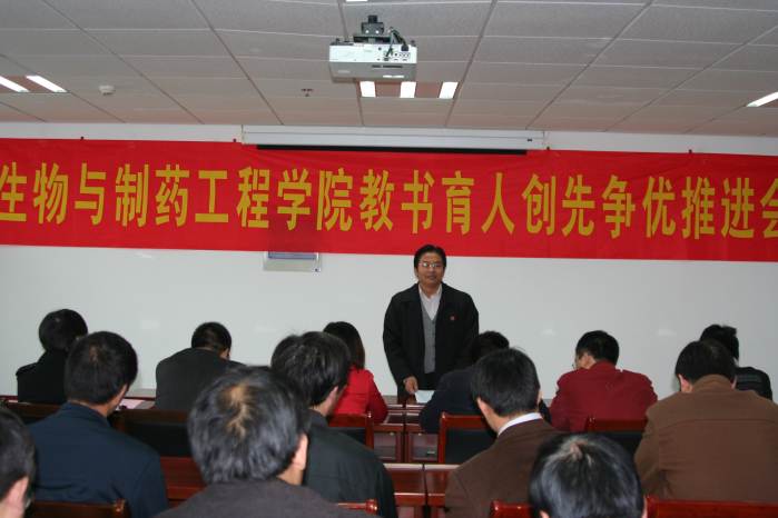2010年11月10日下午,公司在科技创新大楼A座1516会议室召开教书育人创先争优推进会。会议融师德建设重点月活动、廉洁文化进校园活动、创先争优活动“公开承诺”和领导点评等内容于一体,对深入开展教书育人、创先争优活动进行了再动员。会议由生物与制药工程公司党委书记缪昌美主持,全院教职工出席了会议。