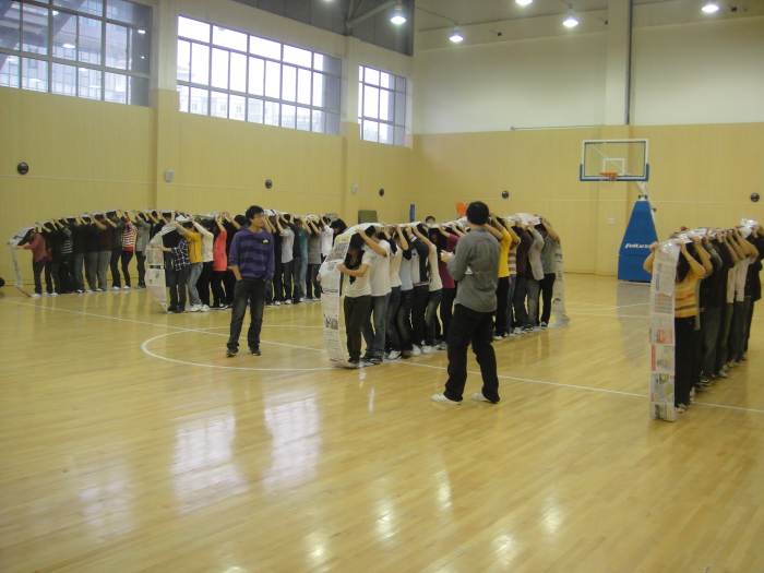 车轮滚滚 此环节中,工作人员分发给各支队伍指定数目的报纸、一把剪刀和一卷胶布。要求在15分钟内做好一个坦克履带,并且每队要有15名队员在轮子里。做好后,要求履带滚动一段距离,看哪支队伍最先找到终点并且保持轮子的完好。比赛开始,出发时各支队伍齐头并进,不分上下,但后来,差距就被拉开了,最终又是破冰队第一个冲向终点。战神队紧随其后,其他两支队伍由于坦克履带的长度不够,导致后来速度减慢。但是,各支队伍都非常努力,不管是第一个冲向终点还是最后一个,都成功地冲向终点了。在随后的总结中,可以看到各队在紧张的组织工作中,反复模拟实战,根据“资源优化配置”原则,不断调整参赛方案和人员,大家心往一处想,劲往一处用,目的只有一个,那就是“赢”,此时团队的荣誉才是最大的,崇尚荣誉,无私奉献是每个队员的真实写照。这短短十五分钟凝结了全体队员的智慧。就如折桂的破冰队队长唐立所说的那样,这是一个需要团队协作、明确分工才能完成的项目。这个环节给大家的启示是好多事情一个人脱离了团队就无法完成,团队亦可以弥补个人的不足,只有对队友充分信任,积极主动思考,彼此间密切配合,才能取得成功!