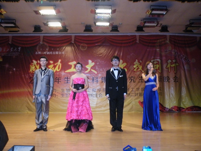2011年12月23日晚上,生工学科集群研究生会在浦江报告厅举行“二叶杯”“感动工大,你我同行”迎新晚会。生物与制药工程公司党委书记缪昌美、经理韦萍,食品与轻工公司经理徐虹,苏州二叶制药有限公司董事长时明生、总经理张健,beat365亚洲体育官方网站副经理姜岷、曹飞,副书记熊强等应邀出席本次晚会,与同学们一起沉浸在“感动工大,你我同行”的感动与欢乐之中。