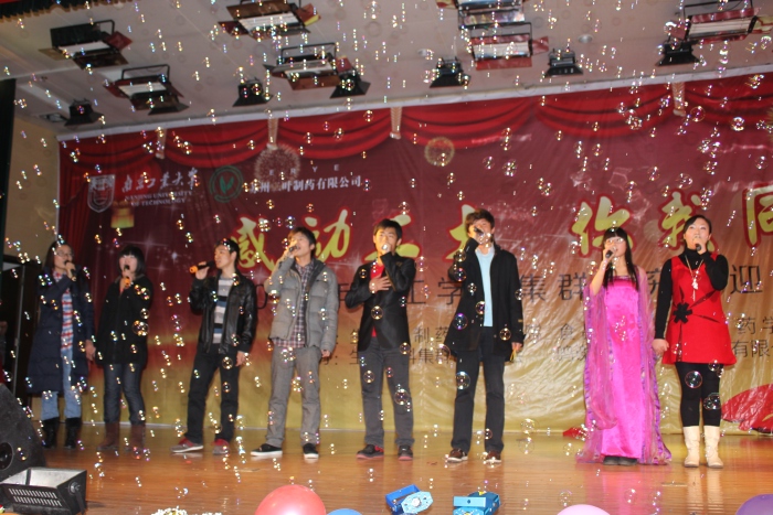 晚会开始前,舞台大屏幕上一幕幕反映生工学科集群研究生会在过去一年里举办的精彩活动及感动的瞬间,为整场晚会烘托出了浓浓的氛围。一曲充满青春动感的舞蹈拉开了序幕。随后,《魔法诱惑》中喷火变玫瑰、以一个酒瓶变出六个,让人眼花缭乱,不知奥妙,意犹未尽;相声《戏说工大》基于现实和创新的基础上,独到的释义,精准的演绎,引人发笑的同时又发人深省;歌曲串烧展示了同学们的多才多艺,青春活力;而鼓楼特校师生们的歌舞与古筝表演,则让我们深受感动,孩子们的每一个动作,每一个音符都饱含艰辛,尽管他们异于平常孩子,与人交流困难学得慢,但他们却愿意付出比常人多出几倍的努力与汗水来练习,为的就是给大家带来欢乐、给自己展现自我的舞台,这种精神,这份真情怎不叫人动容;紧接着的话剧《还珠格格之非诚勿扰》以时下流行的无厘头语录与大胆夸张的动作逗得观众们哈哈大笑,拍手叫好;手语舞《我很快乐》、街舞《dangerous》和新疆舞《吐鲁番的葡萄》分别向我们展示了不同舞种的魅力,同时也充分展示了同学们的奔放激情;小品《招聘》以现实生活为原型,展现了当今社会的现实面,通过演员们活灵活现的表演给观众们带来了无限的欢声笑语,将晚会的气氛推向高潮。另外,本次晚会的亮点Cosplay《三国杀》,将时下流行的网络游戏搬上舞台,引起了同学们的共鸣。此外,贯穿整场晚会的游戏和抽奖环节,使台上台下互动起来,让更多的观众参与其中,享受快乐。最后,伴着《爱,因为在心中》的优美旋律,生工研会全体成员用优美和动情的歌声,为此次迎新晚会画上了圆满的句号。历时三个小时的晚会,台上流光溢彩,气贯长虹,台下掌声雷动,笑声起伏。