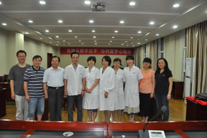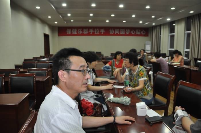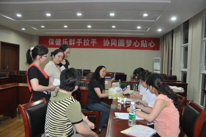 7月5日,校医院经理董正祥、校医公司党支部书记何军等6名医护人员,冒雨如约早早来到生工学科楼一楼报告厅,以“保健乐群,协同圆梦”为题,为beat365亚洲体育官方网站教职工进行血脂、血糖、血压检测义诊活动。