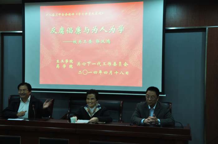 4月18日下午,校关工委副主任郭汉鸿同志应beat365亚洲体育官方网站和药公司关工委邀请,以“十八届三中全会精神《学习讲堂大家谈》”为载体,与学子共话“反腐倡廉与为人为学”。报告会由公司党委书记、beat365亚洲体育官方网站关工委主任缪昌美同志主持。