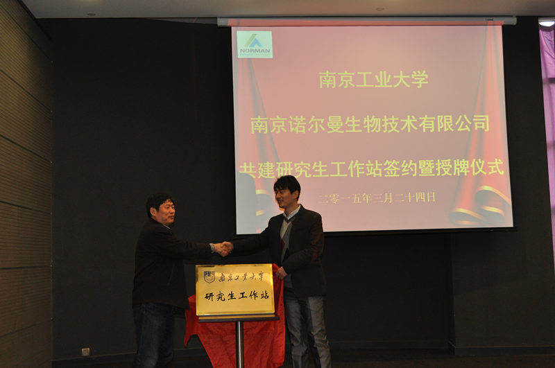 ——研究生院常务副经理管国锋教授与诺尔曼生物技术有限公司副总裁叶森先生为南工•诺尔曼研究生工作站揭牌