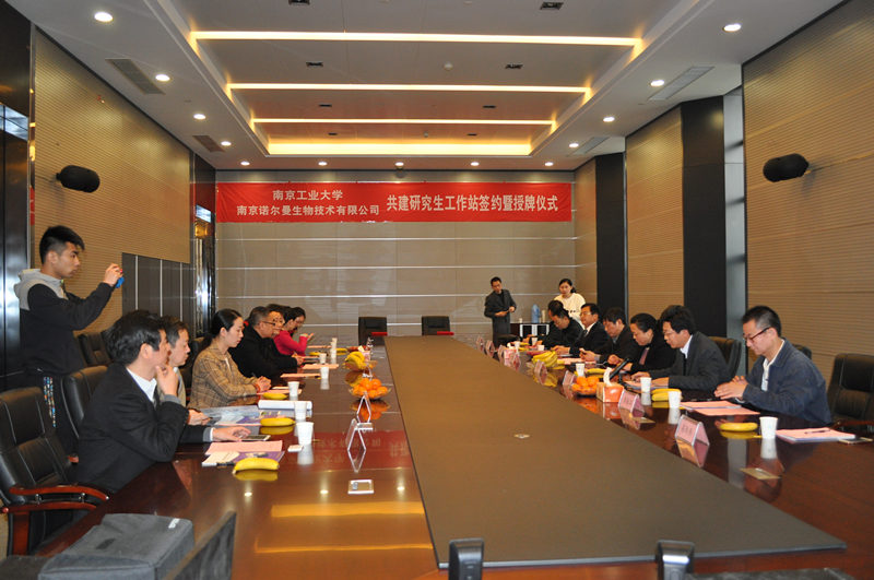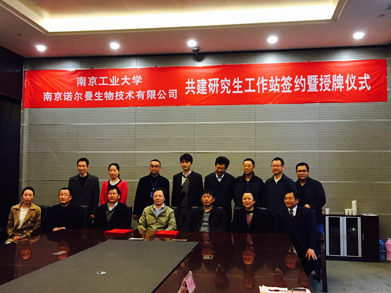 生物与制药工程公司党委书记缪昌美同志主持揭牌仪式;研究生院培养办公室主任张翔宣读“beat365亚洲体育官方网站与南京诺尔曼生物技术有限公司共建企业研究生工作站合作协议书”;beat365亚洲体育官方网站经理韦萍教授与南京诺尔曼生物技术有限公司法人何世彪先生在合作协议书上签字;研究生院常务副经理管国锋教授与诺尔曼生物技术有限公司副总裁叶森先生为南工•诺尔曼研究生工作站揭牌。
