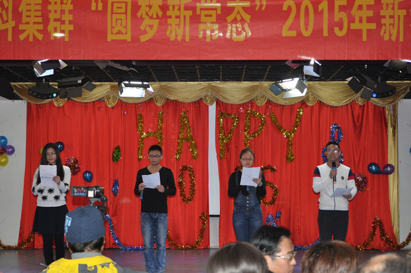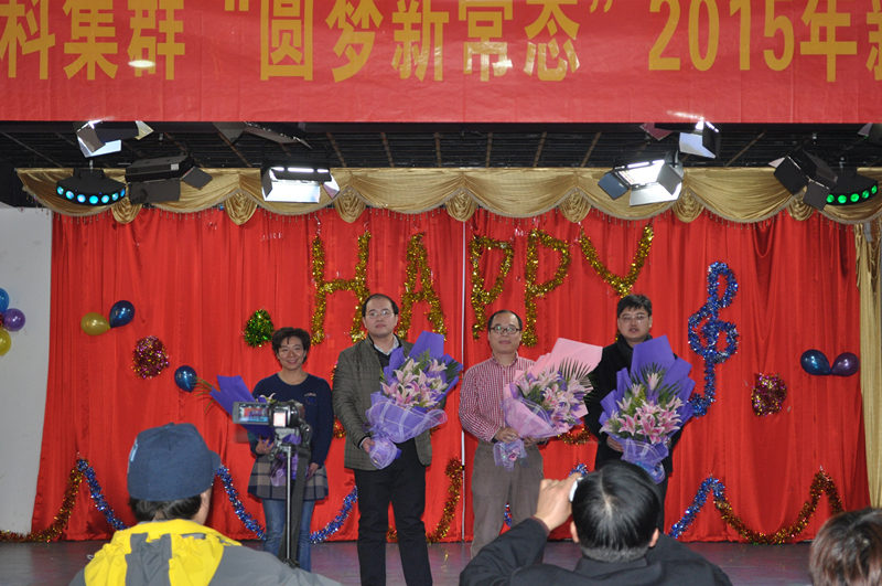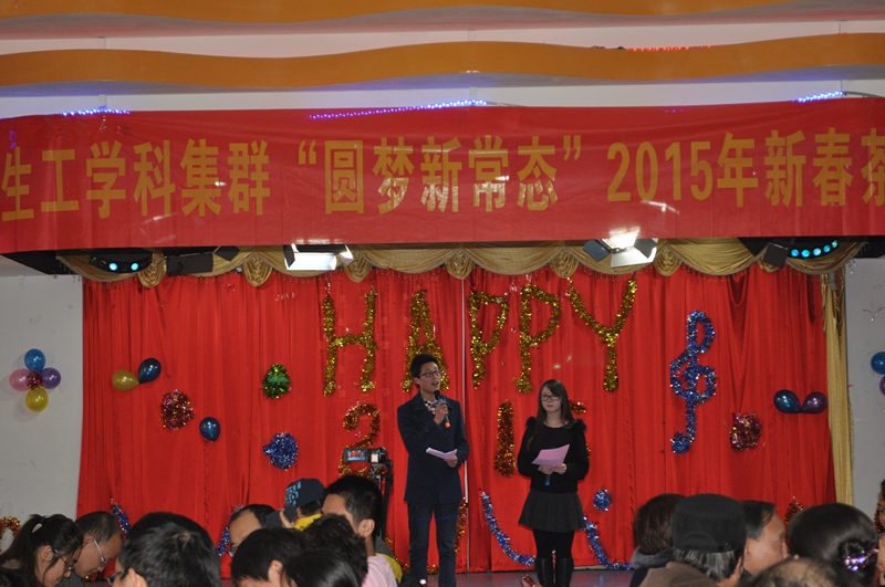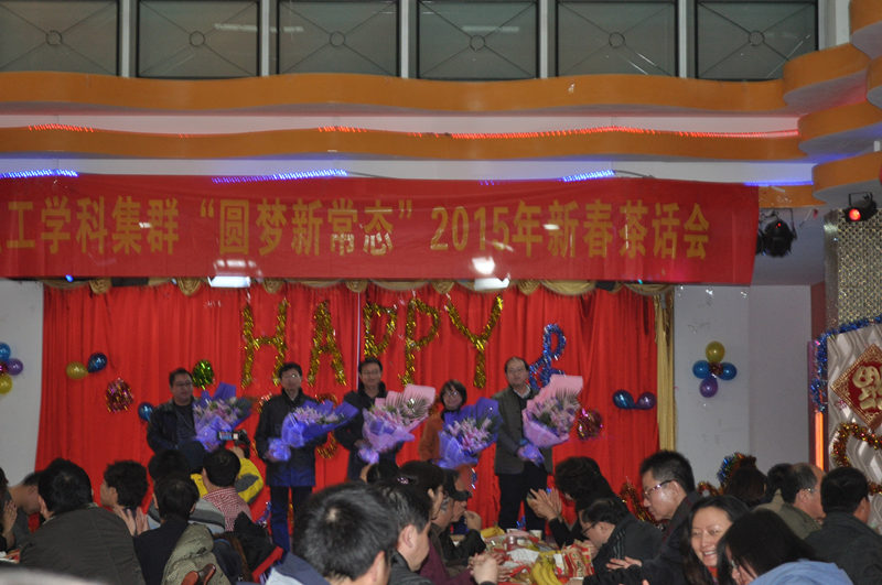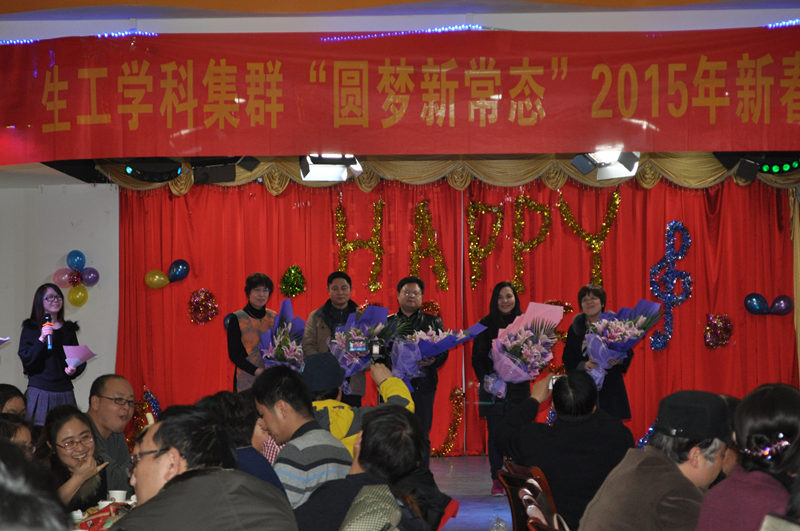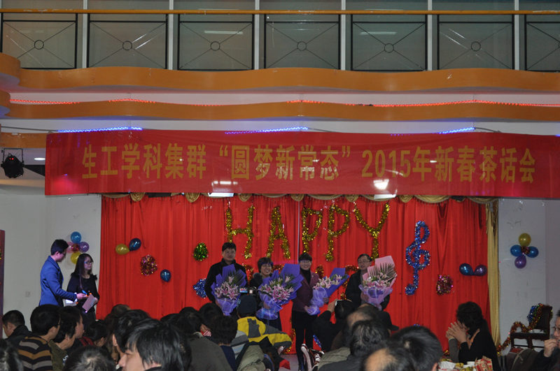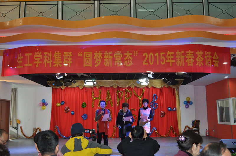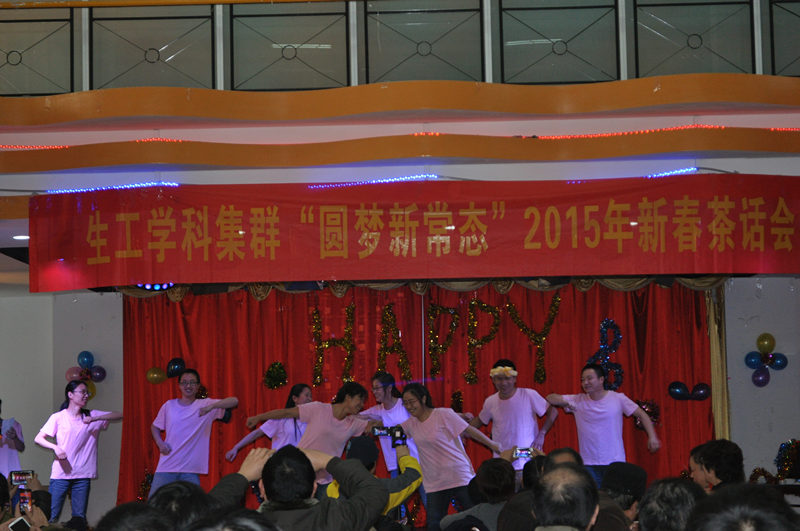 茶话会上,生工学科集群师生悉心准备的联欢节目让现场充满了欢声笑语。创新中心老师们的歌舞《桃花朵朵开》,尽显生工学科集群老师的青春与活力;实验中心老师们的对唱《风吹麦浪》以他们自己录制的MV为背景,颇为感人温馨;生工学科集群研究生会选送的自创朗诵《远航》,展示了生工学子志存高远、脚踏实地的精神面貌;独舞《雨竹林》让大家领略了民族舞独特的魅力;生物工程系的合唱《阳光总在风雨后》,传递出经历风雨仍怀希望的豁达;生工中心老师们的小合唱《我的好兄弟》展示了共勉同乐的情谊;药公司老师们合唱的《相亲相爱一家人》,传递出生工学科集群像一个大家庭一样温暖;由两位研究生十佳歌手合唱的《因为爱情》,用歌声打动人心;由三院学办老师合作的舞蹈《小鸡小鸡》,欢快的旋律将茶话会的欢乐气氛推向了高潮;轻化老师们的合唱《明天会更好》,为大家送上了新的一年的祝福。由欧阳平凯院士和生工学科集群领导班子成员合唱的《同一首歌》,让整个会场沉浸在“万马奔腾辞旧岁,三阳开泰迎新春”的意境中,生动地展现了生工学科集群积极适应和引领新常态的自觉和自信。