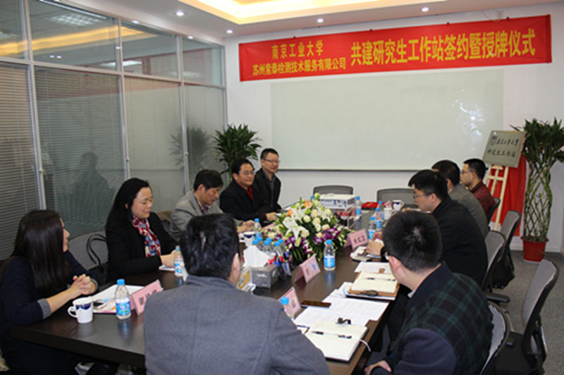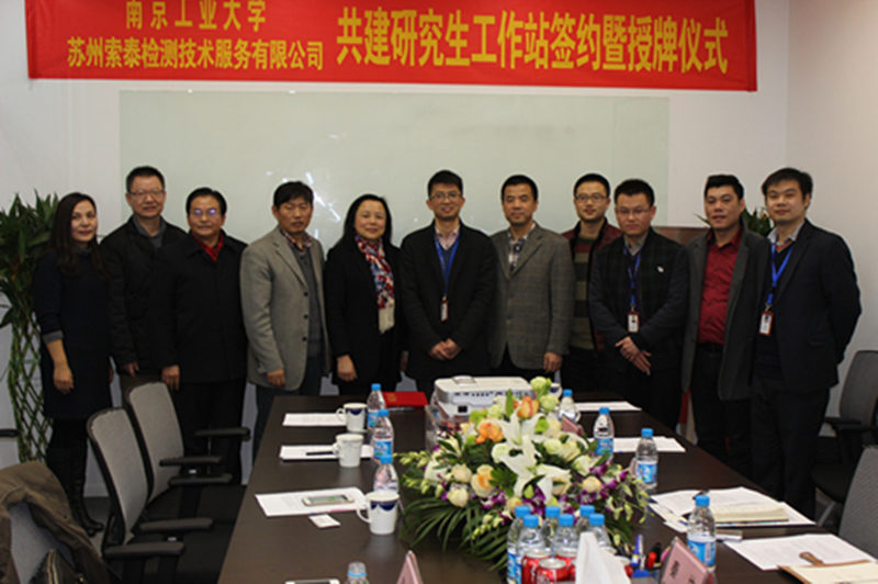 beat365亚洲体育官方网站名誉书记缪昌美同志主持揭牌仪式;南工•索泰研究生工作站负责人谢婧婧教授宣读“beat365亚洲体育官方网站与苏州索泰检测技术服务有限公司共建企业研究生工作站合作协议书”;beat365亚洲体育官方网站经理韦萍教授与苏州索泰检测技术服务有限公司总经理朱红卫在合作协议书上签字;研究生院常务副经理管国锋教授与苏州工业园区组织人事局副局长邹小伟为南工•索泰研究生工作站揭牌。
