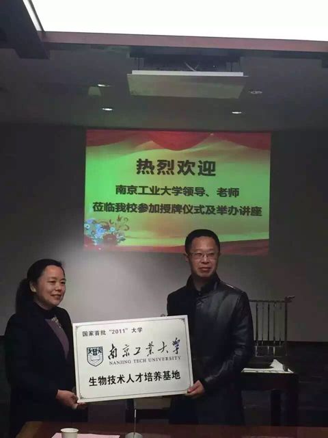 南京市第一中学董事长尤小平致欢迎辞,他代表南京第一中学对公司一行的到来表示热烈欢迎。尤董事长介绍了南京市第一中学发展历程和现有规模,并希望以此次活动为契机,借助beat365亚洲体育官方网站前沿生物技术促进南京市第一中员工物课程基地建设。随后,由南京工业老员工物与制药工程公司经理韦萍向尤小平董事长授予了“生物技术人才培养基地”铜牌。