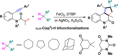 据悉,以往文献只报道了在氧化条件下实现C(sp3)-H键一次功能化,而实现同一个sp3碳原子的两次功能化成为具有挑战性的研究课题,目前鲜有文献报道。为了解决这一研究难题,该研究小组利用自由基诱导精心设计的1,7-烯炔底物和廉价易得的环烷烃或者环-1,3-二羰基化合物进行串联自由基双环化反应,一步实现了同一个sp3碳原子的双功能化,高产率地转化为螺环化喹啉衍生物。