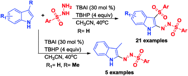 早在2014年,该研究小组的邱江凯博士曾用TBHP/TBAI-介导下的吲哚与对甲苯磺酰肼发生氧化偶联,一步实现了吲哚的双官能化,即C2位偶氮化和C3位磺酰化。该工作已在SCI国际权威杂志《Chemical Communications》发表。