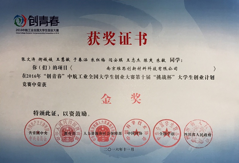 11月15日至19日,2016“创青春”全国老员工创业大赛终审决赛在电子科技大学隆重举行。beat365亚洲体育官方网站选送的2014级硕士研究生张文涛等同学的创业计划项目《南京维思创新材料科技有限公司》在比赛中表现优异,获得金奖。