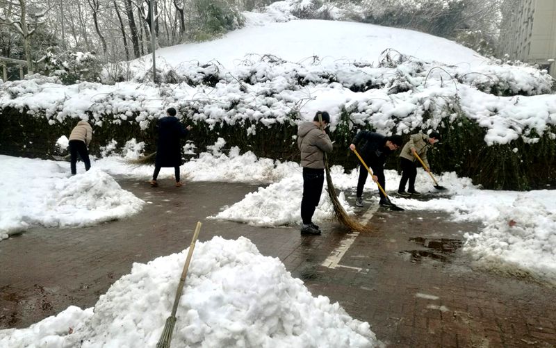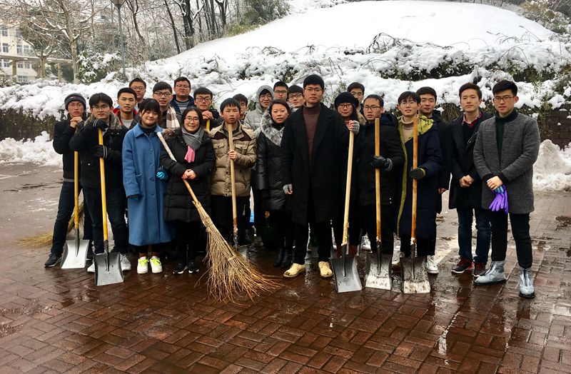 2018年1月3日南京市迎来今冬的第一场雪,至5日清晨,校园内出现“忽如一夜春风来,千树万树梨花开”的场景,厚厚的白雪覆盖了公司校园和长长的街道。伴随着凛冽的寒风,气温骤降。道路上的积雪有的已经结冰,导致路面情况极为不好,为保障师生出行安全,公司第一时间就号召同学们开始了今年冬季第一次扫雪任务。公司本科生、研究生在学办主任朱皓、吴玲燕老师以及员工干部的带领下,自发加入到扫雪除冰的队伍中。