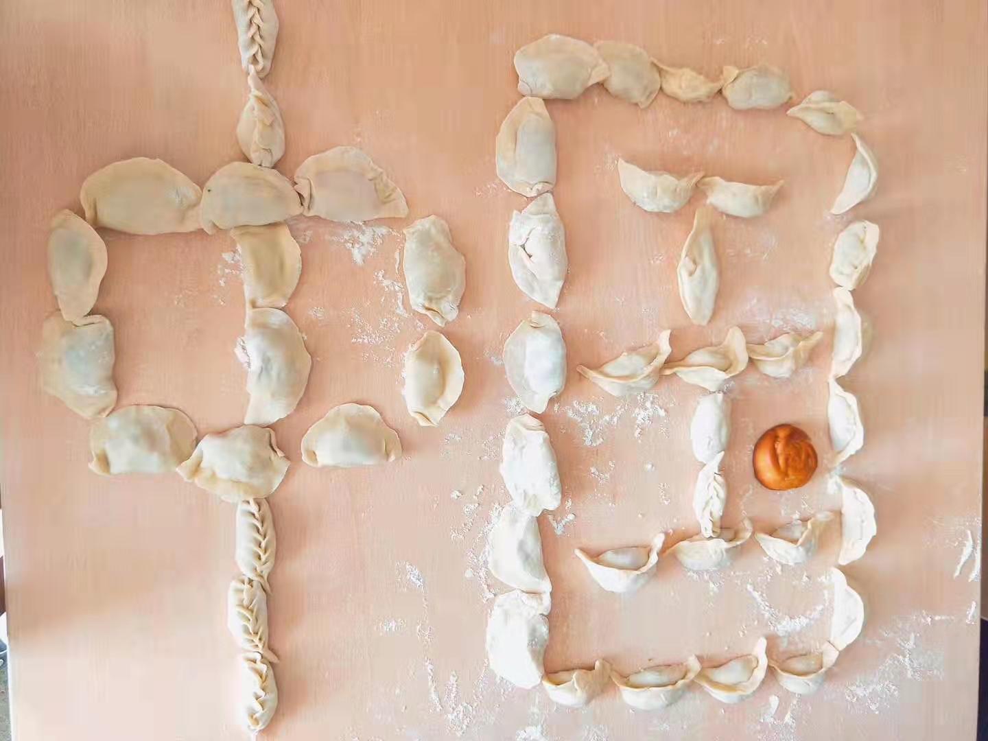 同学们用自己包的饺子拼成“中国”两个字,还自购了国旗,向新中国七十华诞献上深情的祝福。