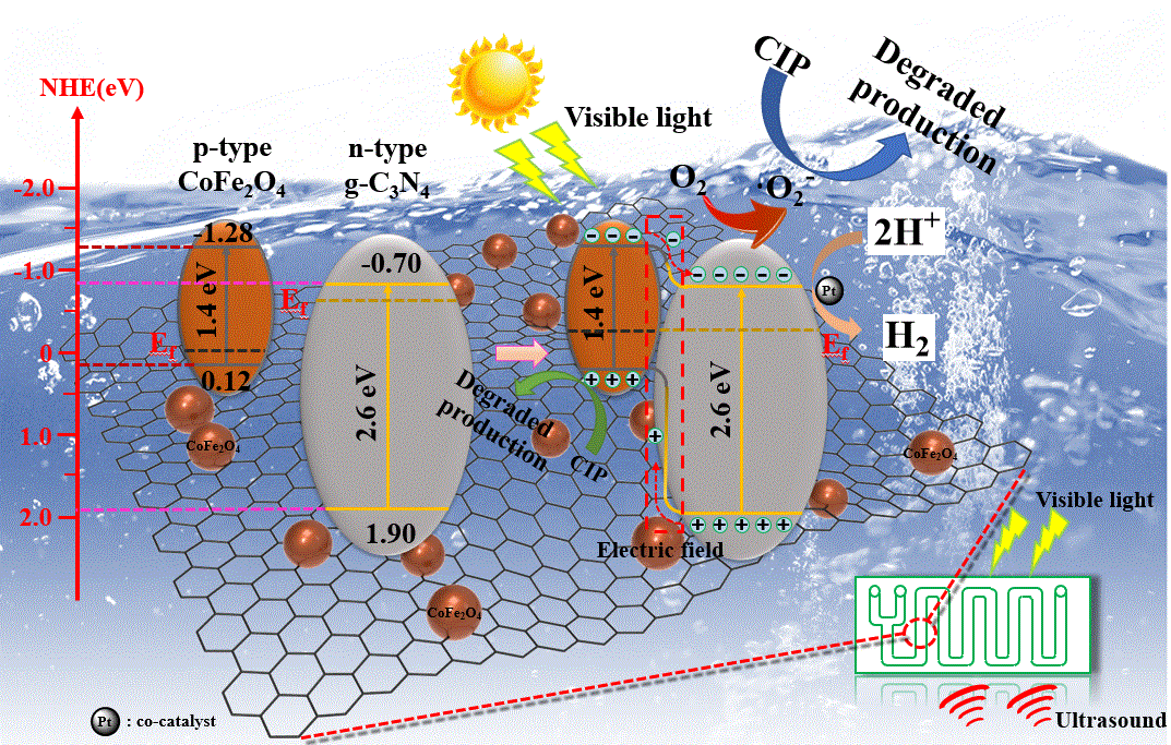 光降解抗生素过程存在两大主要技术难点:一是催化剂活性-稳定性权衡问题;二是光催化降解过程传质换热问题。通过深入剖析上述两大技术难点,beat365亚洲体育官方网站K&k团队首次将微流场声光反应技术应用于光催化抗生素降解过程,通过微流场技术、超声技术与光化学三者间的耦合,强化传质传热过程,提升反应效率;促进光照均匀分布,提高反应稳定性;有效调控声空化过程,强化催化剂表面清洗更新。相较于传统微反应技术(0.149 min-1),微流场声光反应技术(1.07 min-1)可提升反应速率7.2倍;相较于釜式反应技术(0.0356 min-1),微流场声光反应器中的反应速率提升30倍。同时,研究团队通过调节催化剂形貌,设计开发了新型p-n型异质结催化剂,促进光催化剂内生电场的形成,使得光催化抗生素降解活性提升2.33倍,光催化析氢性能提升2.6倍。