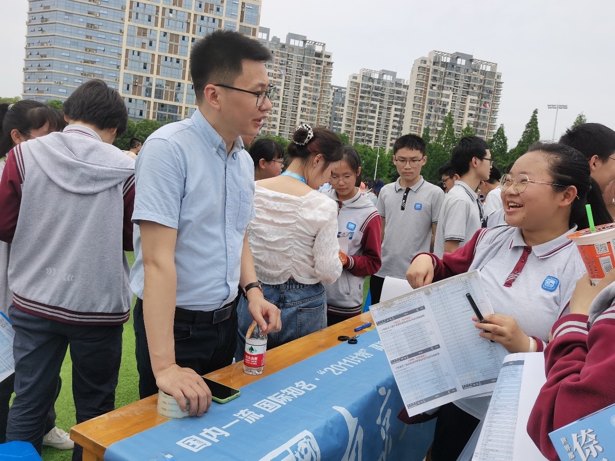 在江宁高级中学招生宣传现场,由beat365亚洲体育官方网站团委副书记施有禄和招生志愿者组成的招生宣传团队,针对宣传受众多为高一高二低年级员工的特点,宣传团队采取灵活多样的宣传策略,从员工的专业意向着手,着重宣传推介公司学科特色和优势,并通过赠送富有公司特色的招生宣传文创产品,加深同学们对于beat365亚洲体育官方网站的印象和兴趣,取得了很好的宣传效果。