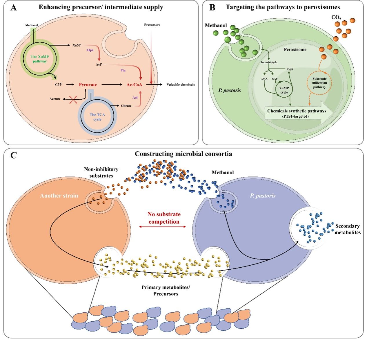 由于毕赤酵母中心碳代谢的代谢通量较低,通过代谢工程手段增强中心代谢尤其是丙酮酸以及乙酰辅酶A的供给对于化学品的生产至关重要。然而,由于甲醇代谢的相对刚性,对于代谢网络的改造尤其是敲除仍需考虑胞内的能量与还原力平衡。对于毕赤酵母,基于过氧化物酶体的区室化工程也是有效的策略这一策略不仅可用于强化目标产物的合成,也可用于定位底物利用途径,从而避免有毒中间代谢物对细胞的损伤。此外,作者提出构建一个包含上游菌株以及毕赤酵母的人工多细胞体系是解决前体供给不足的潜在策略(图2)。