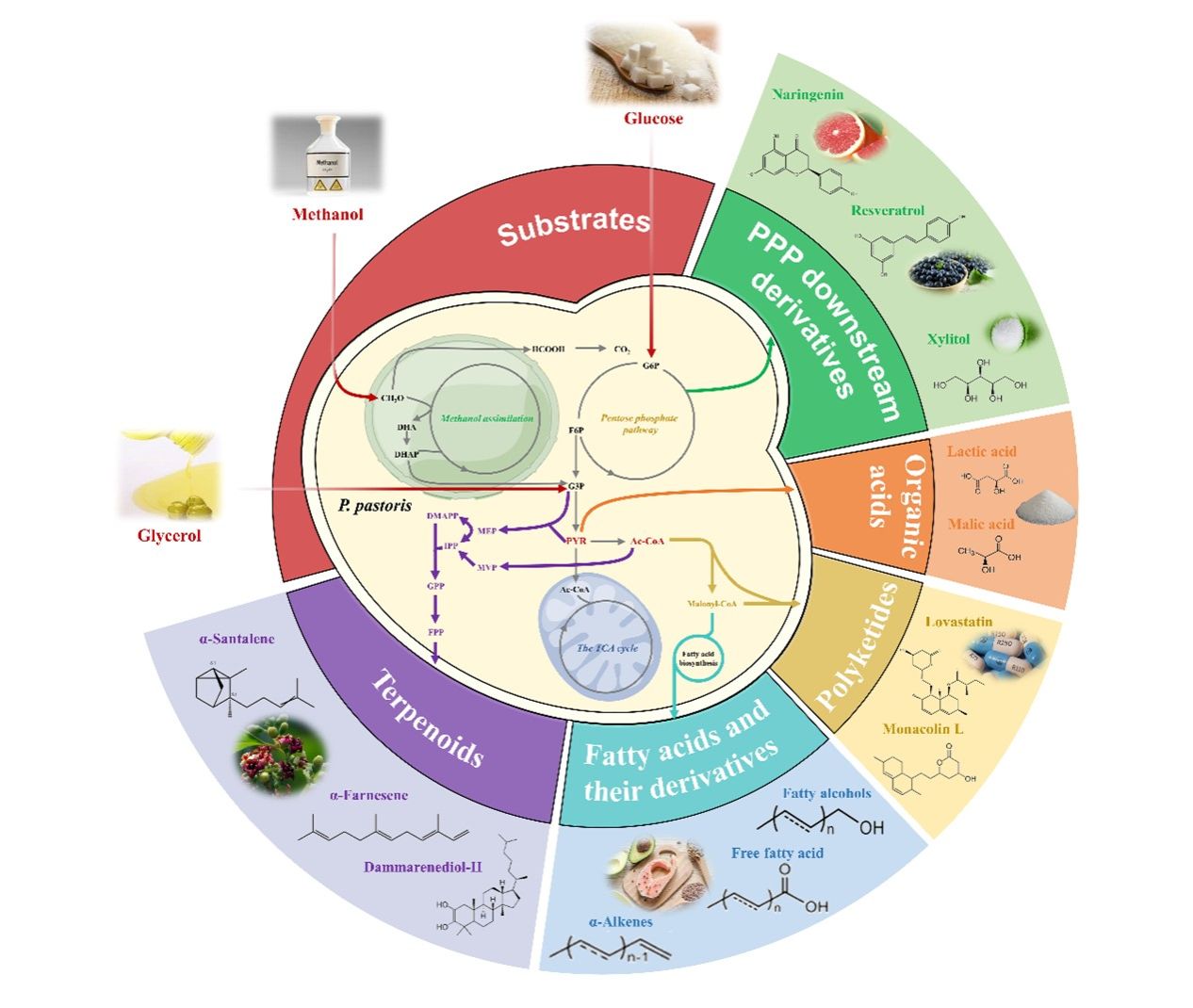 开发毕赤酵母的甲醇细胞工厂需要谨慎考虑目标产物的选择。作为Crabtree-negative酵母,毕赤酵母倾向于将碳通量分配到生物量积累而非代谢物积累,这导致其难以积累大量的初级代谢物。又由于甲醇代谢能够产生大量的还原力,适合毕赤酵母生产的化学品往往是高还原性的次级代谢物,例如脂肪酸以及衍生物,芳香族氨基酸,萜类化合物等。
