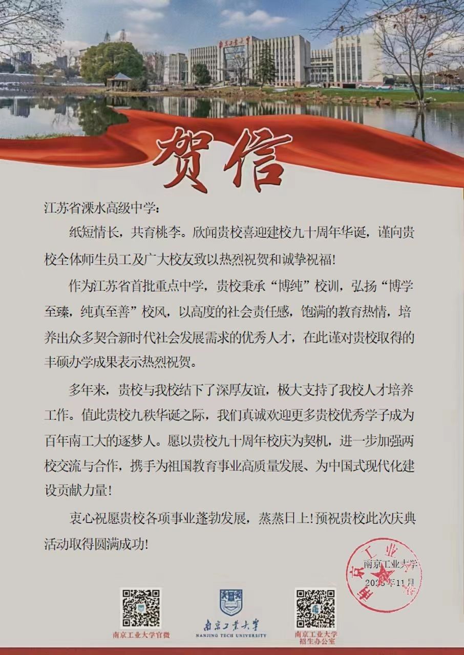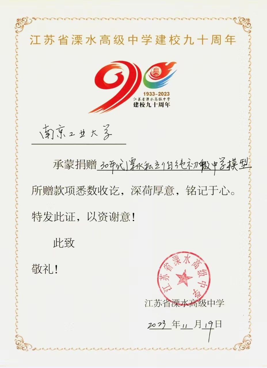 集团招生办公室提前向江苏省溧水高级中学传递了贺信,众多毕业于溧水高级中学的南工大学子为母校90周年华诞送上美好祝福。大会当天向公司赠送了由公司机械公司员工精心设计,体现公司学科特色的中学前身“溧水私立伯纯初级中学”3D打印模型作为校庆贺礼。近年来江苏省溧水高级中学作为公司优质生源基地中学,向公司输送了大量优秀学子,希望两校继续深化交流合作,加强常态化共建,为党和国家共同培育强国建设人才。