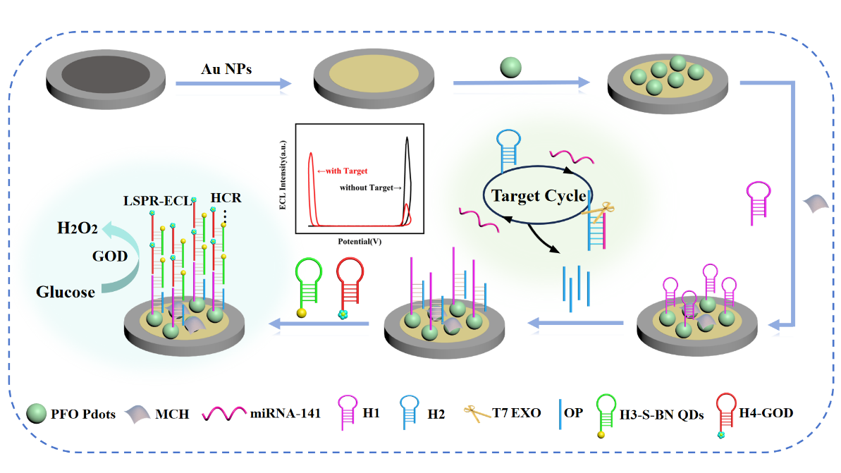 miRNA的表达水平与疾病的发生和发展密切相关,特别是癌症;因此,采用快速的miRNA检测方法对于癌症预防具有重要意义。在这项研究中,我们首次构建了一个比率式ECL生物传感器,双信号扩增机制对痕量靶标进行了有效信号放大,以及金纳米颗粒(对PFO Pdots的低电位诱导发射和对S-BN QD的LSPR-ECL信号增强效应)的双重作用实现了对miRNA-141的灵敏检测;同时原位产生的过氧化氢有效的淬灭了阳极发光,增强了阴极发光,从而巧妙的构成了比率式生物传感器的信号变化。该研究为生物标志物检测提供了一种独特的方法。