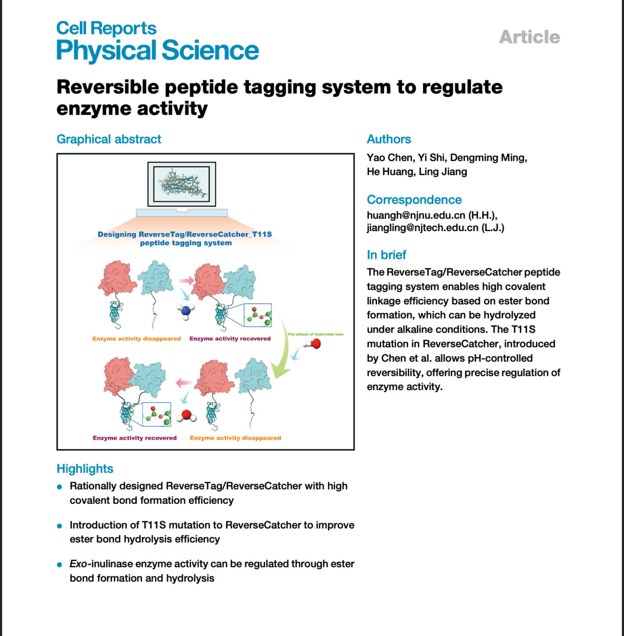 近日,南京工业老员工物与制药工程公司2021级博士研究生陈耀以第一作者发表在Cell子刊《Cell Reports Physical Science》上,并作为2025年第三期封面,文章题为“Reversible Peptide Tagging System to Regulate Enzyme Activity”。该研究设计了一种基于酯键的分子肽系统,具有高效的共价连接能力,并利用酯键在碱性条件下可水解的特性,提出了一种新的pH响应型酶活性调控策略。这一创新性研究为酶活性的精确调控提供了全新的工具和方法,预计将在生物医学、合成生物学及工业生产等多个领域产生广泛影响。南京师范大学黄和院士与beat365亚洲体育官方网站食品与轻工公司江凌教授为该论文的共同通讯作者。研究得到了国家自然科学基金和国家重点研发计划等项目的资助支持。