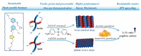 结合生物基环氧树脂的功能化开发已有研究基础,beat365亚洲体育官方网站K&k团队基于朴酚类化合物与5-羟甲基糠醛自主开发了新型生物基环氧单体结构,首次通过一锅法构建互穿聚合网络体系,并借助于聚合工艺优化实现互穿网络结构的调控,从而得到具有扭曲叠加和平面编织的微观结构。通过上述策略构建的环氧树脂材料,其储能模量可以高达5.04 GPa, 且工作温度范围可提高到230℃左右;该结构同时也赋予了材料较好的介电性能、抗形变性能以及阻燃性能等等。此外,针对新型结构进行碳化实验,选择性控制实现生物质碳资源的向生物质石墨烯结构的转化。相对于传统的石油基和已报到的生物基环氧树脂材料,该工作均显示出很好的技术优势。