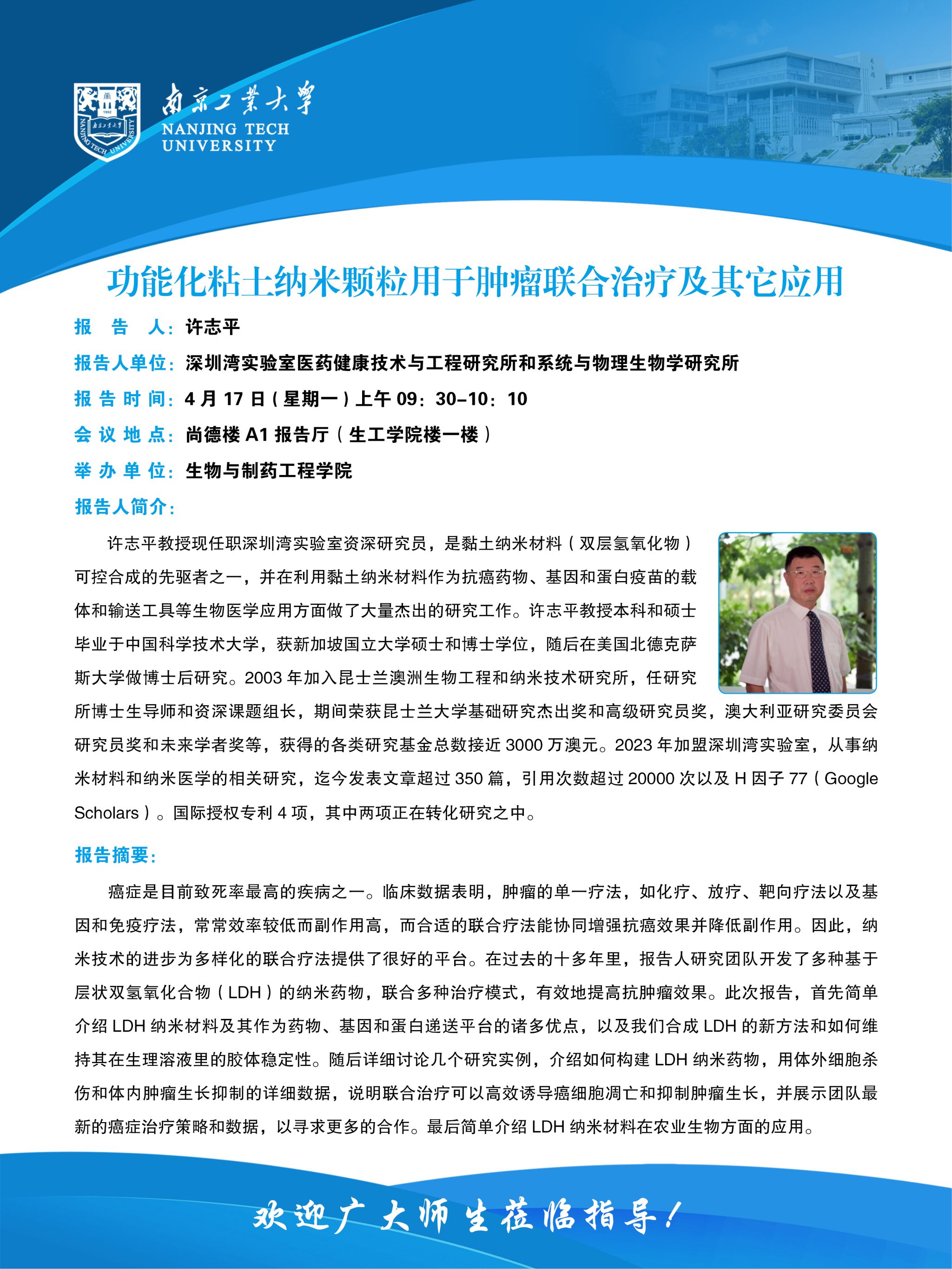 报告题目:功能化粘土纳米颗粒用于肿瘤联合治疗及其它应用